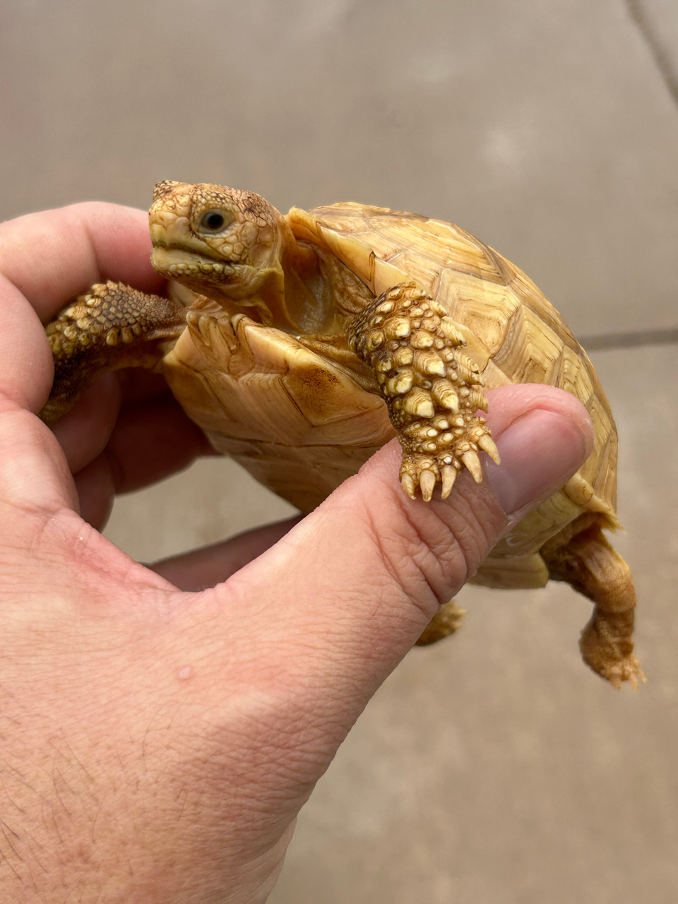 Description: Sandy beige color almost throughout their body, head and legs. Some will develop a darker "honey" color. Aggressive spikes on their front legs help them to dig and prevent being pulled out of their burrows backwards (which is nearly impossible to do). The "spurs" on their rear thighs between the tail and legs give them their "spur-thigh tortoise" name.